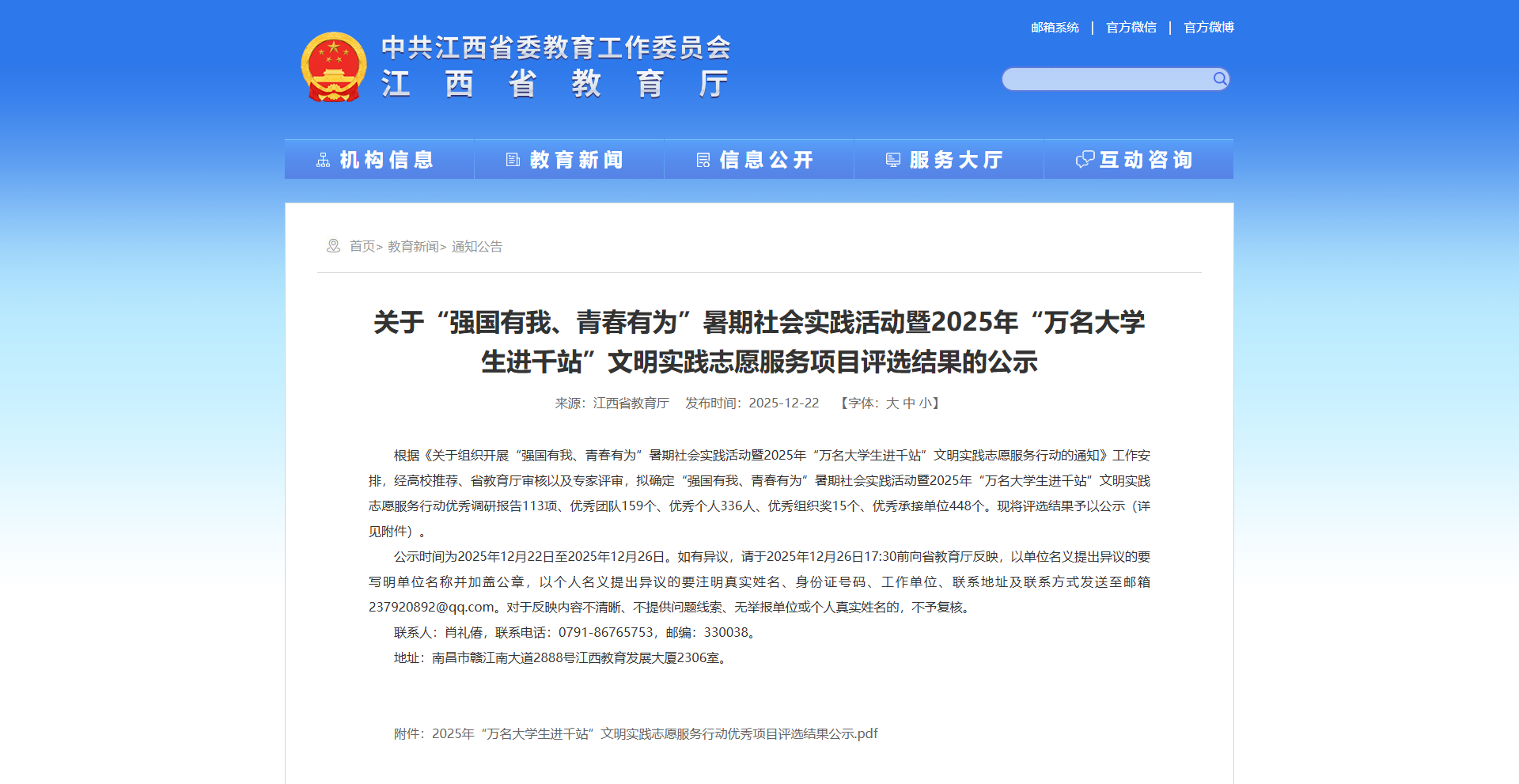 近日,中共江西省委宣传部、江西省精神文明建设办公室、江西省教育厅、共青团江西省委联合发布“强国有我、青春有为”暑期社会实践活动暨2025年“万名大学生进千站”文明实践志愿服务项目评选结果,我校师生凭借优异表现获优秀团队、优秀个人、优秀指导教师三项荣誉。